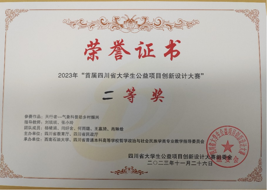 2023年11月26日,首届四川省大学生公益项目设计大赛决赛于西南石油大学举行,以我校英国威廉希尔公司本科生与文化艺术学院研究生组成的“天行者”气象科技志愿者团队完成的“气象科普助乡村振兴”的作品,通过答辩评审荣获大赛二等奖。团队采用“气象科技志愿者+社会工作者”相结合的创新型公益服务模式,提出气象科普助力乡村振兴公益事业发展方案。