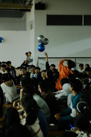 《击鼓传花》游戏里,老师同学们共同参与,气球花随音乐穿梭在人群中,随着音乐停止,拿到花的同学们各显神通,展现自我,互动趣味满满。