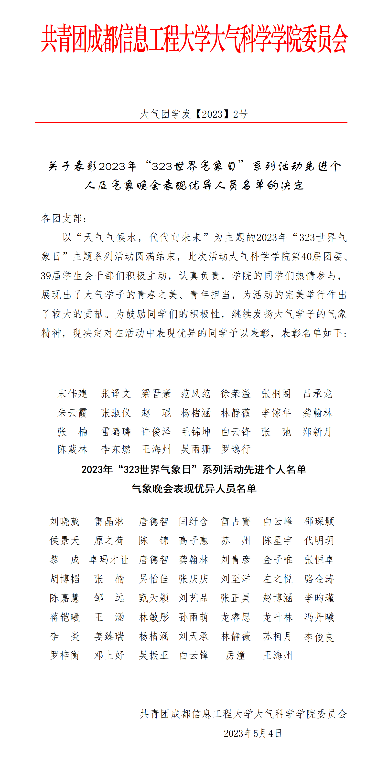 关于表彰2023年“323世界气象日”系列活动先进个人及气象晚会表现优异人员名单的决定