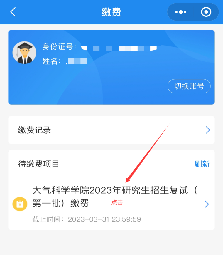 第五步,登陆进入后,核对姓名和身份证号信息,确认无误后点击“待缴费”,如图4所示。