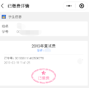 第八步,考生在学院复试报到时,登陆本缴费程序,向资格审查的工作人员出具缴费记录,如图6所示。