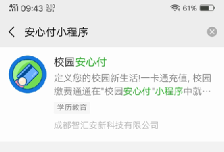 第一步,打开微信,搜索微信小程序“校园安心付”,如图1所示。