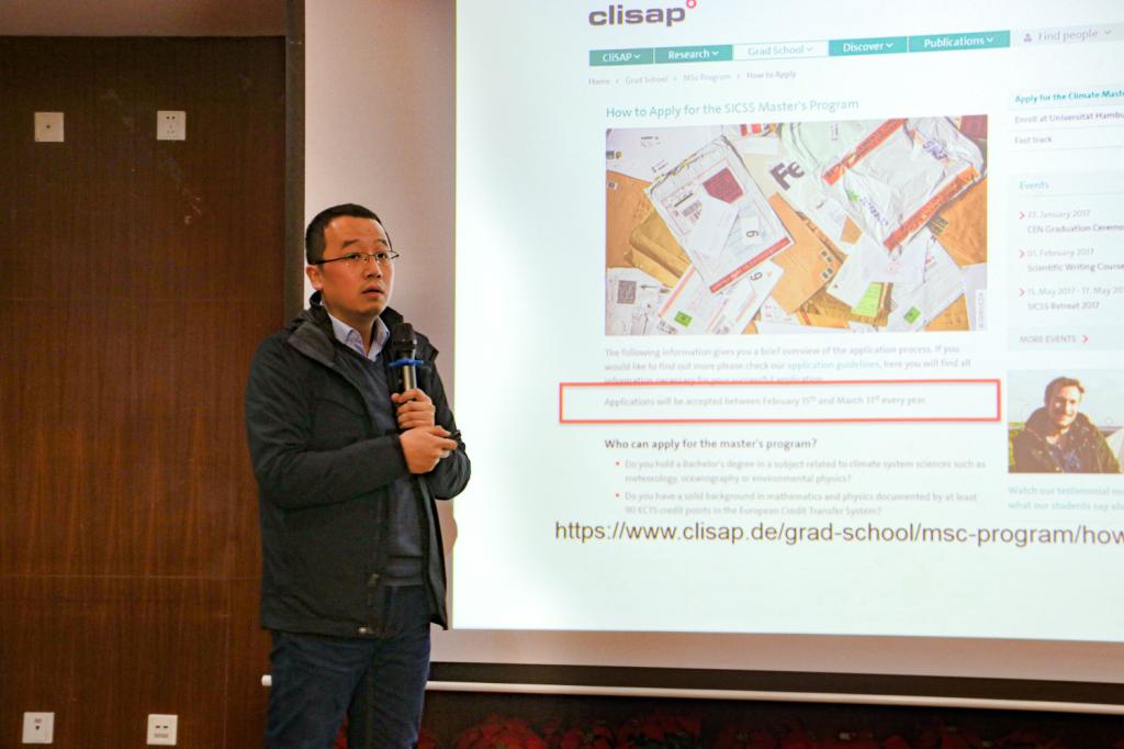 葛非对德国大气科学的相关情况展开讲解。他从德国的基本情况、有关大气科学的高校、如何申请德国高校及在德国生活与学习的感受等方面进行介绍,并为有计划出国留学的同学们提出建议。他鼓励同学们走出国门,多看看世界。