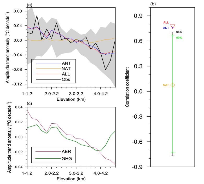 该研究发现近几十年青藏高原气温年循环振幅呈现减弱趋势,且该减弱趋势随海拔高度的增加而增强,这是由人类活动主导的,主要可归因于人为气溶胶的排放。在仅包含人为气溶胶强迫的试验中,人为气溶胶的增加减少了高原冬季高海拔地区的雪盖面积,这可能与前人观测到的高原高海拔地区的气溶胶沉降有关。雪盖面积的减少降低了高海拔地区的地表反照率,增强了高原冬季的增暖,从而导致气温年循环振幅的减弱呈现海拔依赖型。
