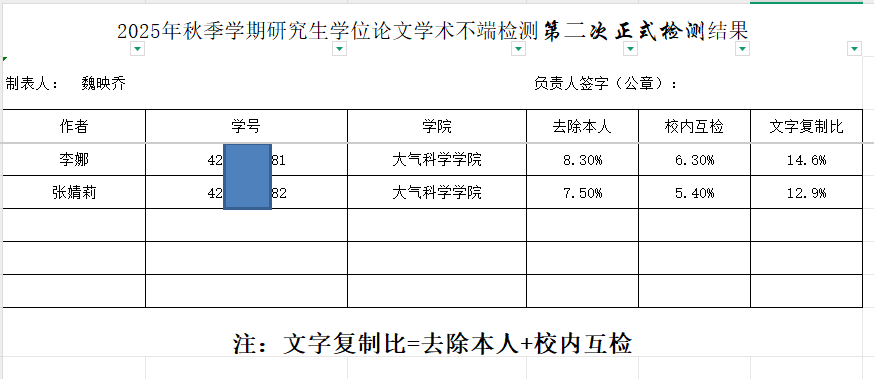 2025年秋季学期研究生学位论文学术不端检测第二次正式检测结果